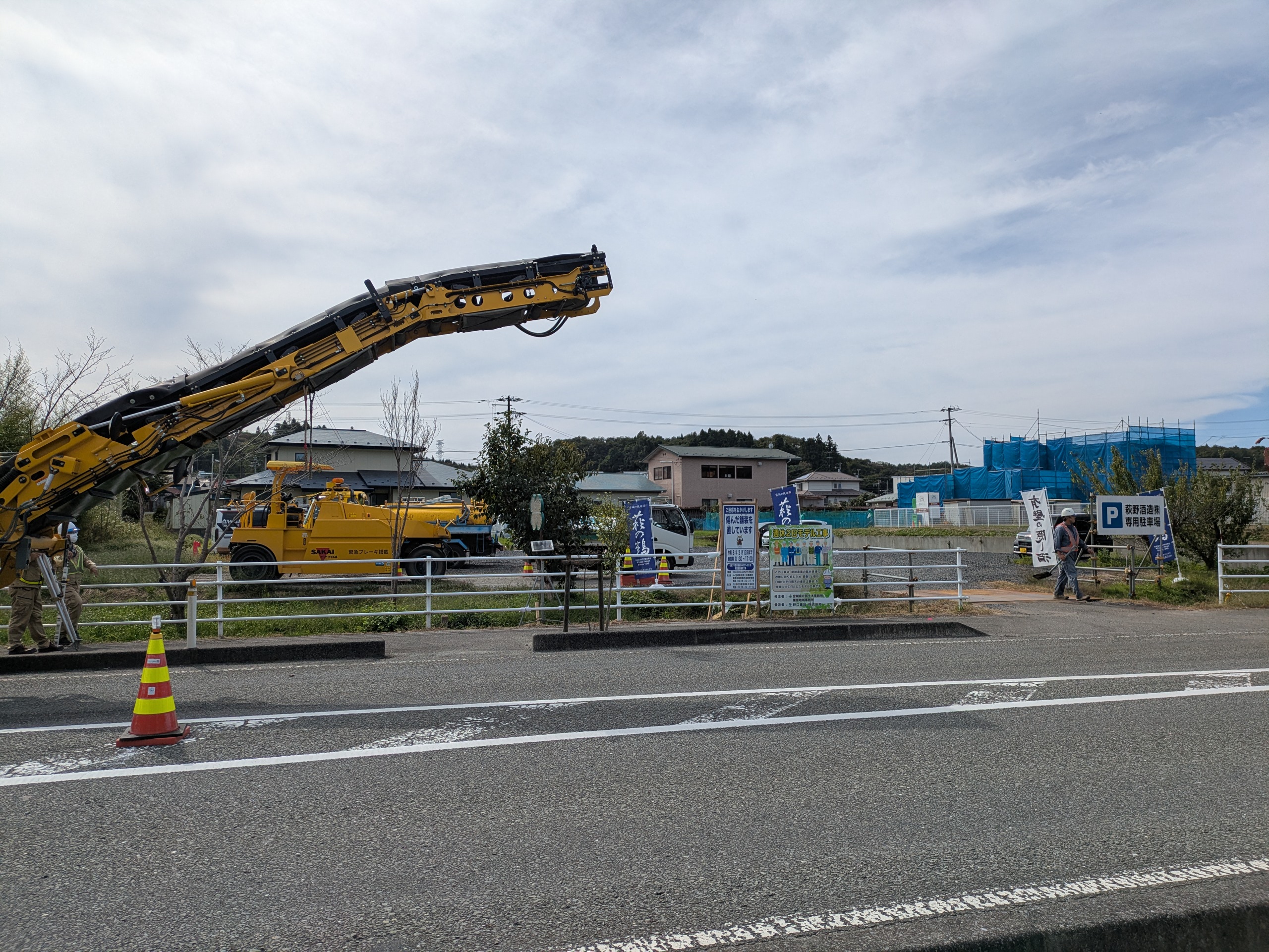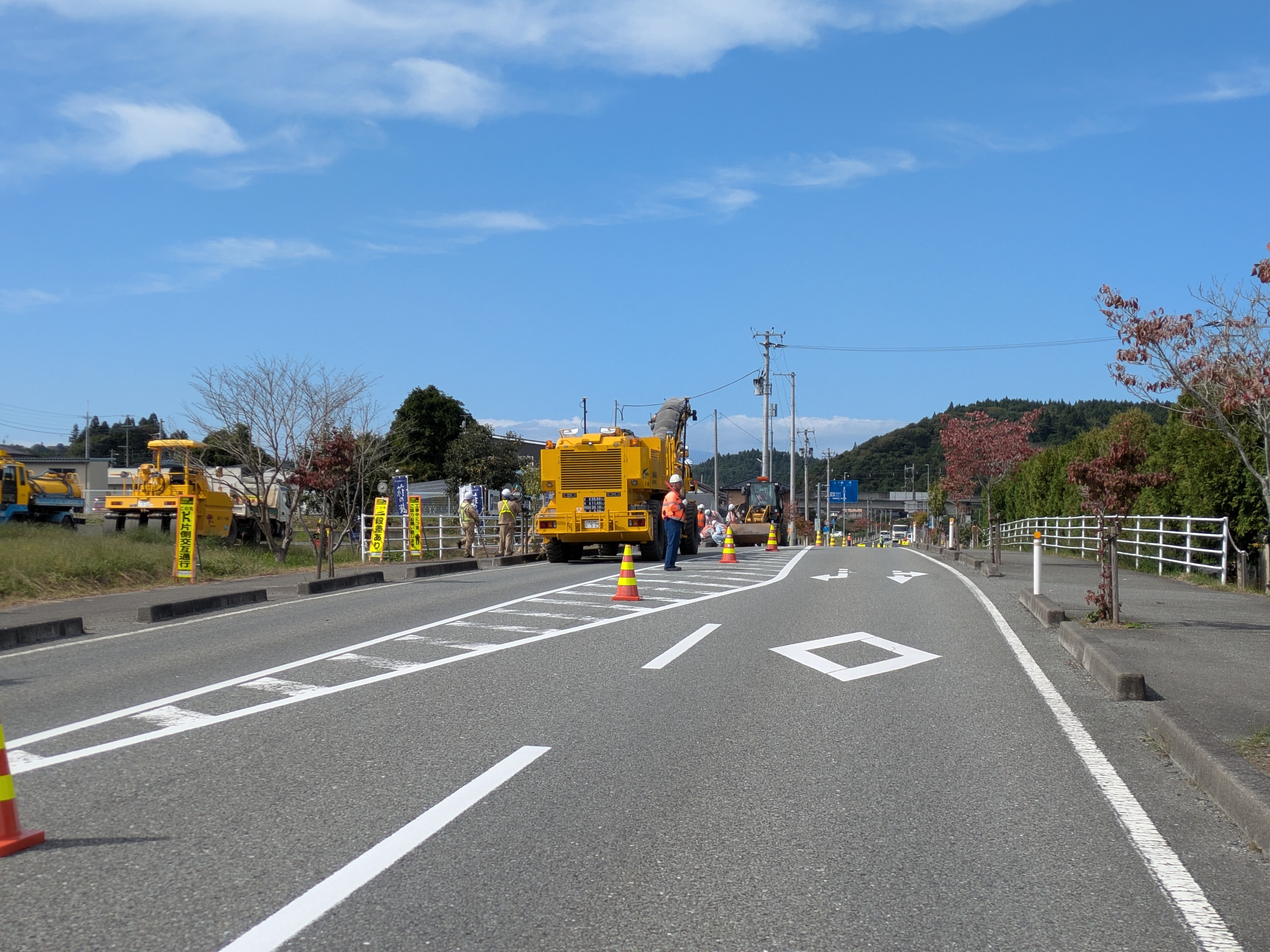 現在、萩野酒造前の県道工事に伴い、片側交互通行の規制がかけられています。また、弊社駐車場から工事車両の出入りもございます。